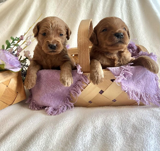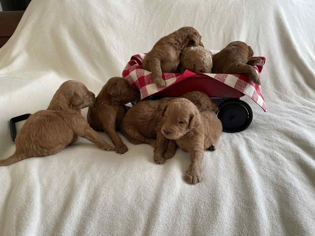 Bella and Leo's puppies were born Oct. 23rd and will be ready to go home with you December 20th. The puppies will be medium size F1b.